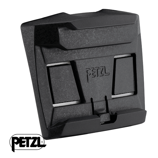 Platine adhésive permettant de fixer une lampe frontale sur un casque, tout en gardant la possibilité de régler l’inclinaison.